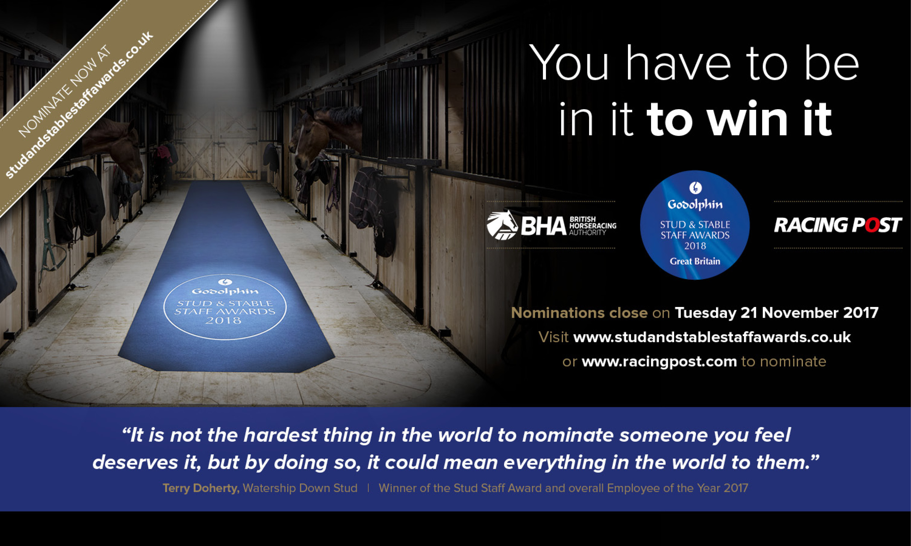 - It’s easy to do – The nomination period closes on Tuesday 21 November and is available to trainers online via the Racing Administration website. Breeders, owners, colleagues and managers can also download a nomination form via www.studandstablestaffawards.co.uk and www.racingpost.com.