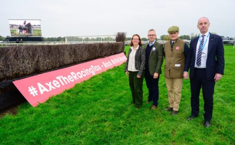 Shadow Treasury Minister James Wild and his wife Baroness Evans of Bowes Park showed their support for the #AxeTheRacingTax campaign at Fakenham Racecourse last week. Pictured alongside Fakenham’s David Hunter and BHA’s Greg Swift. Credit: leaderboardphotography.com