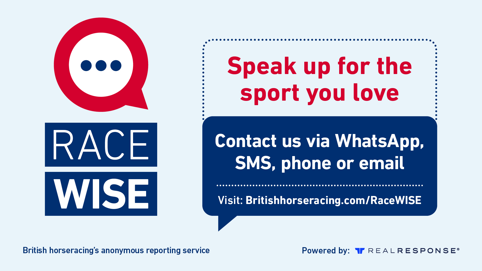 Delivered in partnership with Real Response, the real-time messaging service is managed through a fully encrypted system, giving the person reporting the concerns added confidence that they are doing so safely and with anonymity, irrespective of the method used to contact RaceWISE.