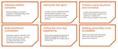 Work in these areas has so far focused on finalising funding and delivery plans. Once complete, the sport will move forward with initiatives such as supporting syndicate ownership, improving the owner experience and exploring ways to create a more easily followable narrative across major race meetings, particularly on the Flat.